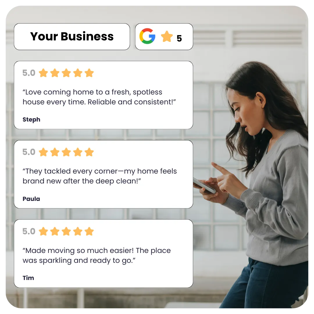 We help cleaning and home-service businesses collect more reviews from happy clients, showcase them on Google, and turn that social proof into repeat business.